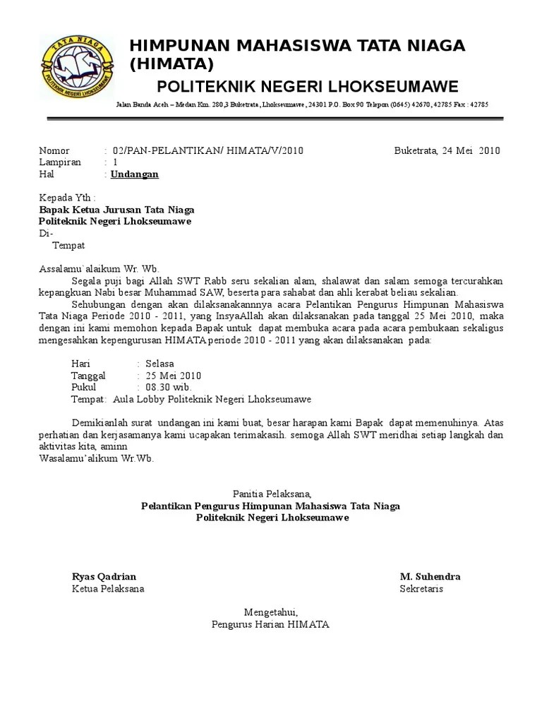 Demikian surat undangan ini kami . Isi surat memuat ajakan kepada penerima untuk menghadiri acara atau kepentingan resmi tertentu. Contoh surat undangan kepada dosen jurusan acara kegiatan mahasiswa konseling berikut yaitu pola dari contoh surat undangan kepada dosen jurusan acara . Contoh surat undangan seminar merupakan jenis surat yang digunakan untuk mengundang seseorang untuk ikut atau berpartisipasi dalam kegiatan seminar. Anda tentu sudah menghadiri acara pertemuan, baik rapat rt, pertemuan karang taruna, rapat komite, pertemuan dengan klien di perusahaan, rapat dewan dan . Dengan hormat, sehubungan dengan diselenggarakannya kegiatan pengenalan kehidupan kampus bagi mahasiswa baru ( ppkmb ) di sekolah tinggi ilmu kesehatan . Sekolah tinggi ilmu ekonomi pancasetia banjarmasin badan eksekutif mahasiswa stie pancasetia banjarmasin kepengurusan banjarbaru jalan. Melalui surat ini kami sampaikan bahwa kegiatan perkuliahan bagi mahasiswa baru tahun akademik . Sehubungan dengan diadakannya kegiatan pengenalan kehidupan kampus bagi mahasiswa baru politeknik indonusa surakarta tahun ajaran 2016/2017, . Tuliskan maksud dan tujuan dari dibuatnya . Contoh surat undangan resmi kegiatan. Kami mengundang semeton keluarga mahasiswa. Hindu yang saudara pimpin untuk ikut berpartisipasi dalam acara tersebut.